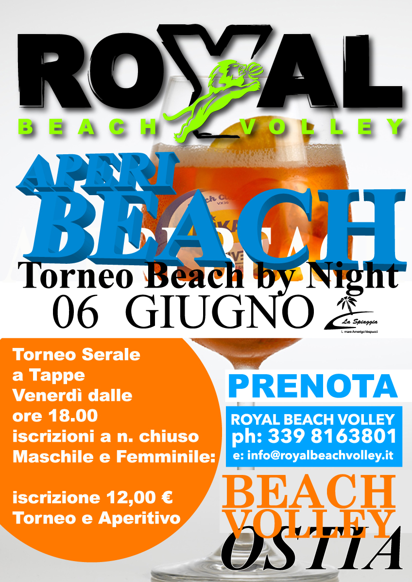 Il primo venerdì di giugno (06 giugno) segna il primo appuntamento con il torneo a tappe che segnerà molti venerdì dell’estate di Ostia. Nella sede estiva della Royal Beach Volley, lo stabilimento La Spiaggia, iniziamo con un torneo maschile e femminile a numero chiuso e in contemporanea un gustoso aperitivo, nel pieno stile ROYAL Spirit.